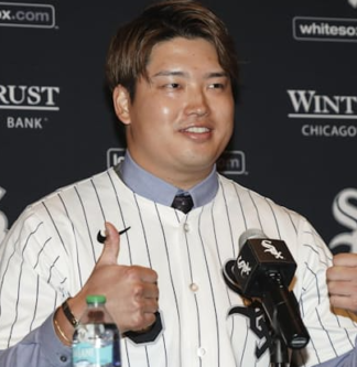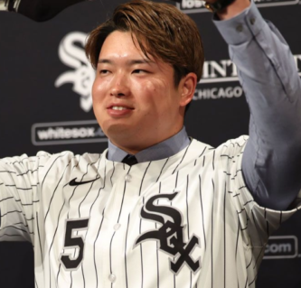 2025年12月、シカゴ・ホワイトソックスへの移籍が決まり、縦じまのユニフォームに身を包んだ村上宗隆選手。