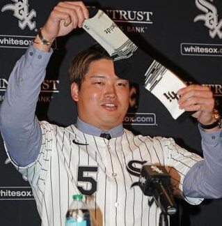 ホワイトソックスの真新しいユニフォームに袖を通した村上宗隆ですが、もう既に貫禄たっぷりですよね!