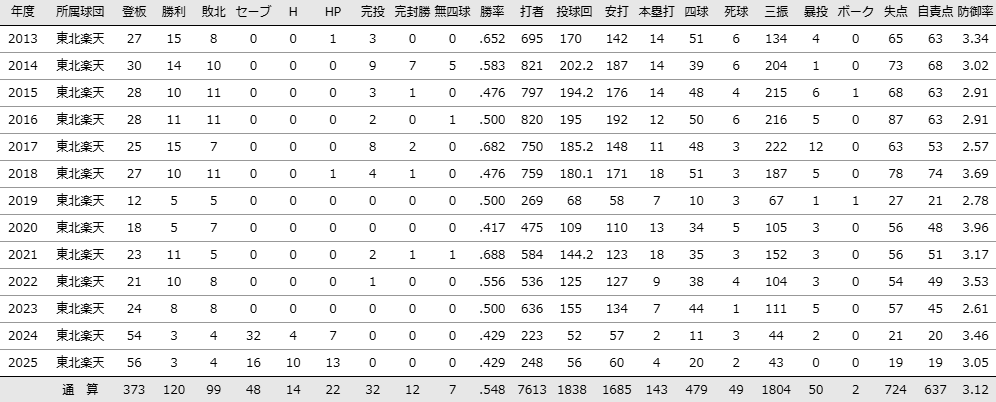 2013年(1年目)から楽天の先発投手として6年連続二桁勝利という安定した投球内容を披露します。